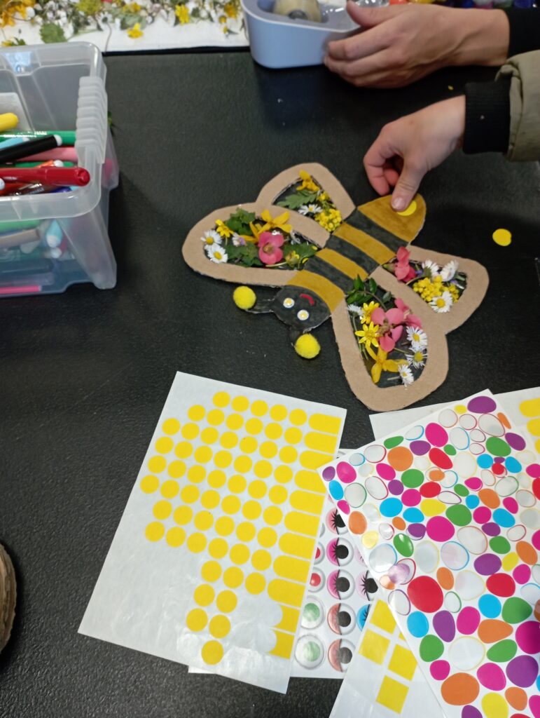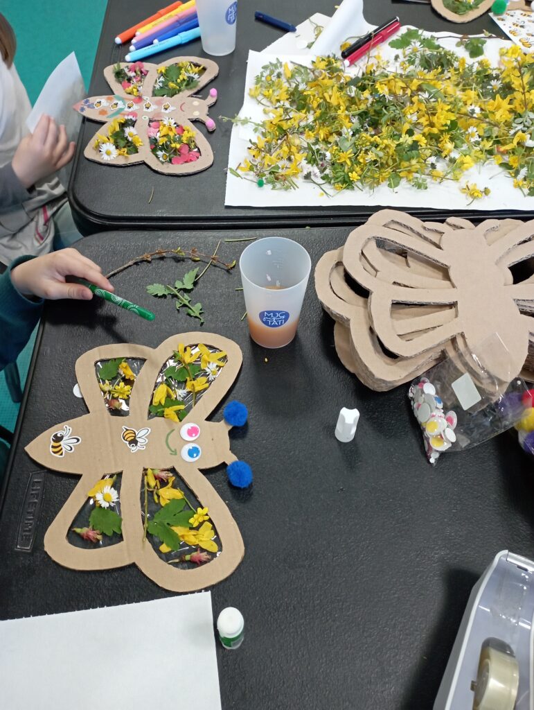 La première, proposée par Alina (artiste orcéenne), était la création d’une abeille/papillon en carton. Les enfants devaient les décorer avec gommettes, pastels et fleurs/feuilles fraiches.