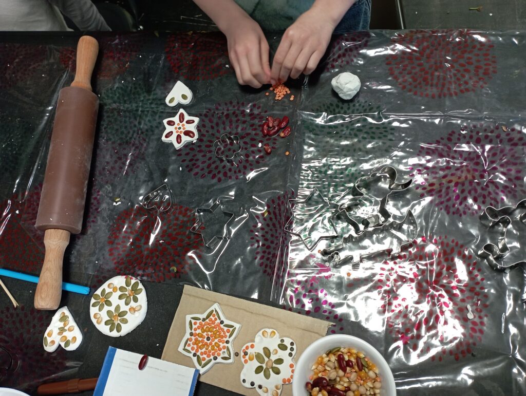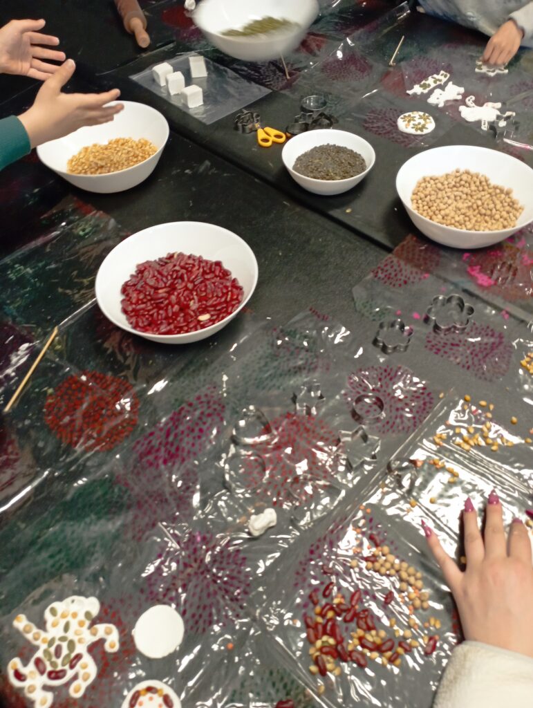 Deuxième animation : création de mosaïque sur de la pâte auto-durcissante avec des graines et légumineuses. Les enfants et les parents ont appréciés utiliser ce nouveau support (que beaucoup de parents ne connaissaient pas) et découvrir les graines d’une autre manière