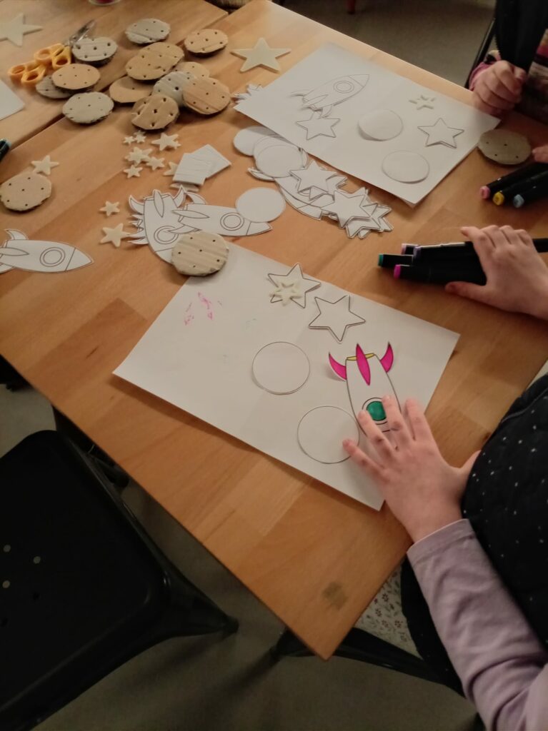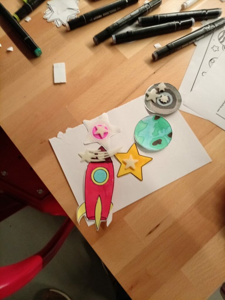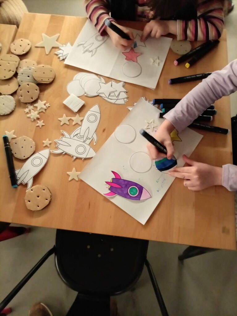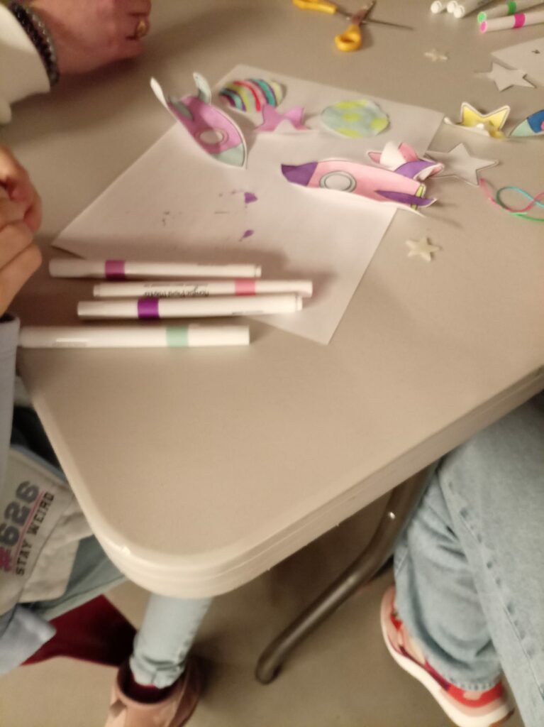 Une œuvre originale, que les petits et les grands ont apprécié chacun à leur façon, et qui s’est poursuivie avec un atelier de création de mobiles (fusée, étoiles et planètes) en papier.