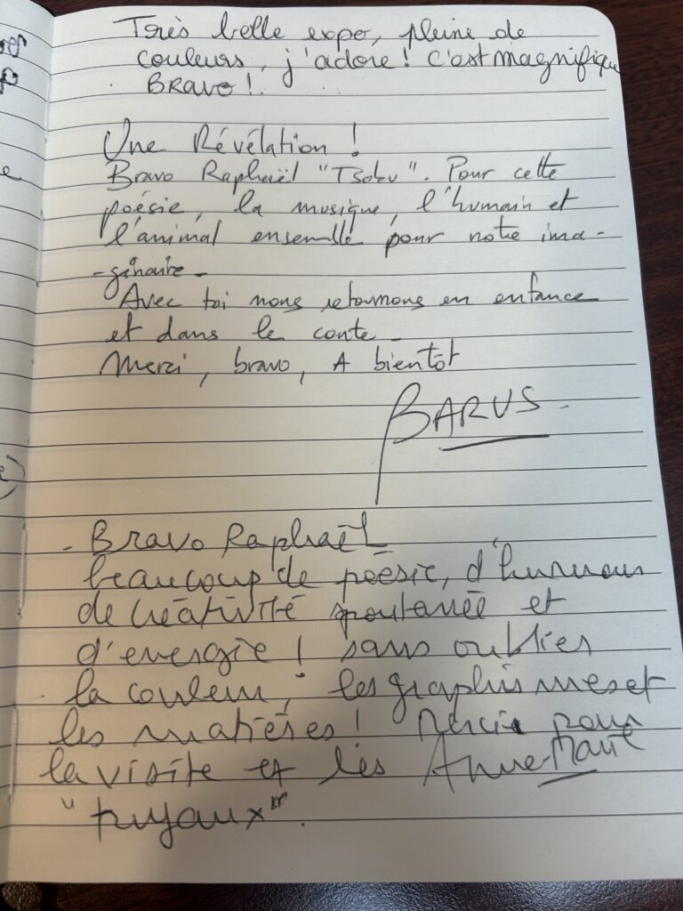 « Bravo Raphaël. Beaucoup de poésie, d’humour, de créativité spontanée et d’énergie ! Sans oublier la couleur, les graphismes et les matières ! Merci pour la visite et les « tuyaux ». »